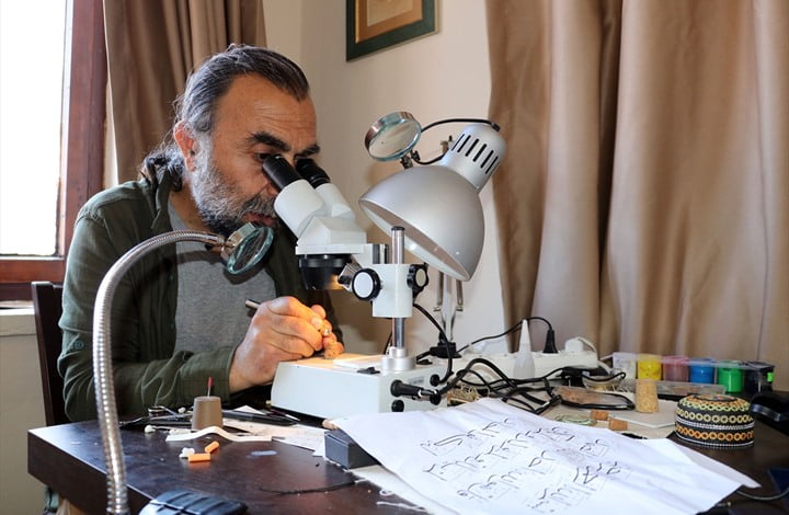 ويحتوي المعرض على أبرز الأعمال الفنية التي عمل عليها النحّات التركي نجاتي كوركماز، ومنها بسملة مكتوبة على شعرة، ومسبحة من بذور التين كُتبت عليها أسماء الله الحسنى، وأحجار شطرنج ولوحات خط مصغرة.