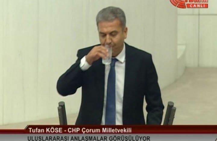 وخلال جلسة البرلمان، أقدم النائب التركي، من حزب الشعب الجمهوري، توفان كوسي، بشرب الماء، ما أثار حفيظة نواب من حزب العدالة والتنمية الحاكم.