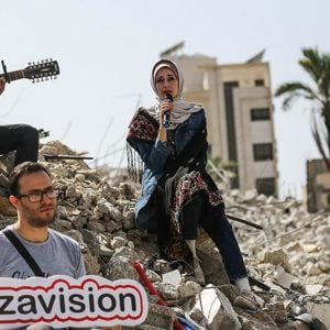 تعالت ألحان موسيقية حماسية وكلمات أغنية “موطني” الفلسطينية، على أنقاض مقر وكالة الأناضول الذي تدمر جراء قصف إسرائيلي قبل نحو أسبوعين، للبناية التي يتواجد فيها بمدينة غزة.