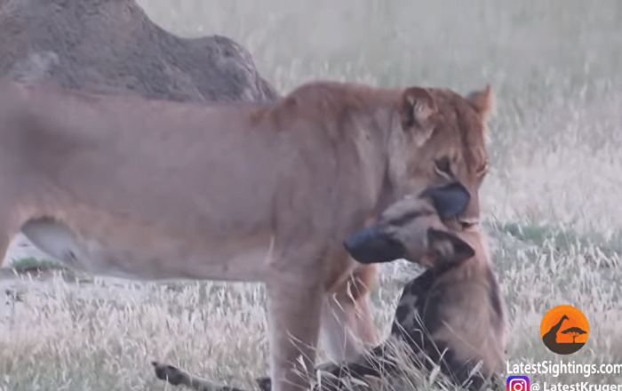 ويظهر الفيديو اللبؤة وفي فمها الكلب البري، حيث لم تظهر عليه أي علامة من علامات الحياة. وفي هذه اللحظة اقترب كلب بري آخر منها في محاولة منه لإنقاذ صديقه.