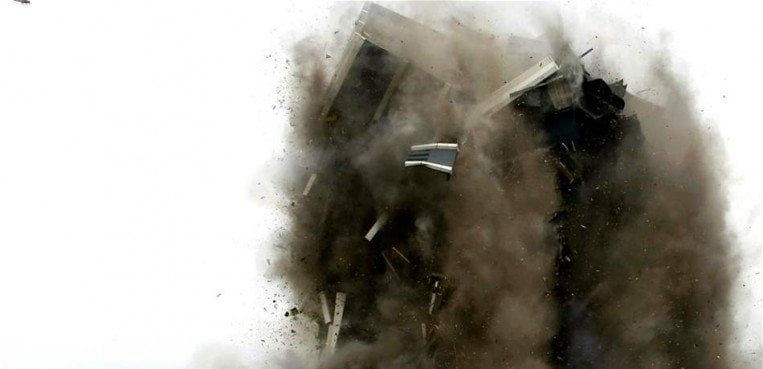 وقامت المتفجرات بهدم دعامات “برج مارتن تاور” الفولاذية ليتهاوى المبنى، الذي يبلغ من العمر 47 عاماً، والذي حفر مكانه ضمن السجل الوطني للأماكن التاريخية على الرغم من حداثته نسبياً. وأدى انهيار المبنى إلى تصاعد سحابة كثيفة من الغبار استمرت لعدة دقائق قبل أن تستقر على الأرض.
