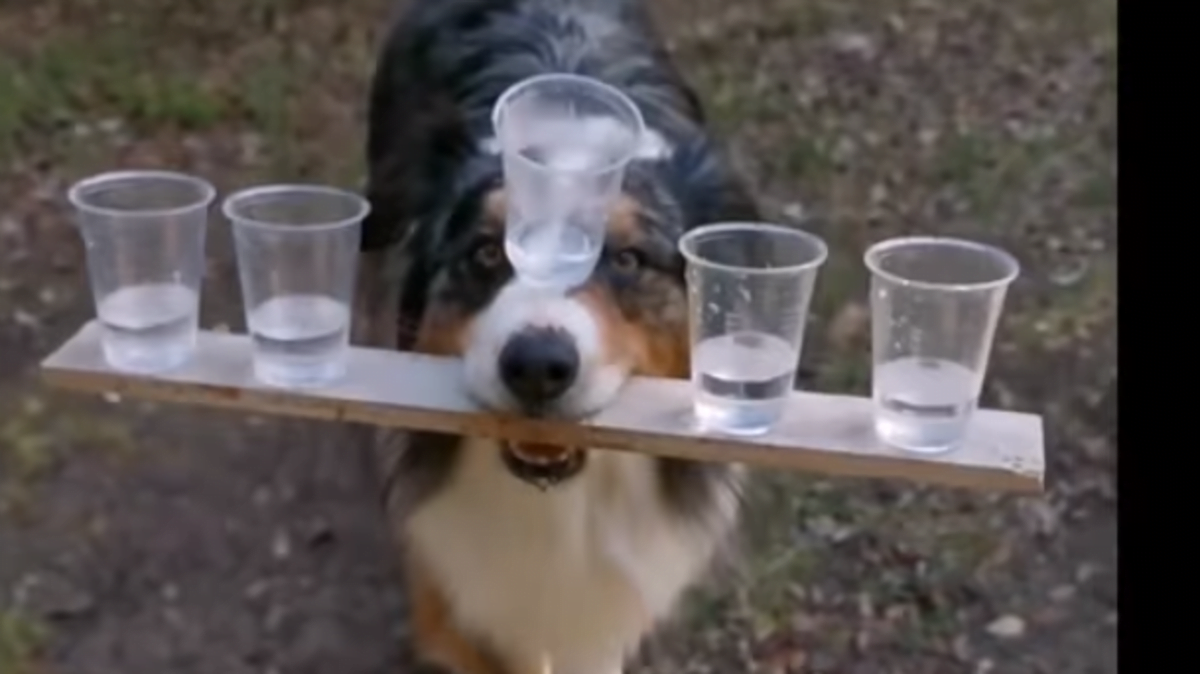 وظهر الكلب الأسترالي وهو يحمل أكواباً مليئة بالماء ويسير بتوازن على منصة خشبية، دون أن يسقط أي كوب.