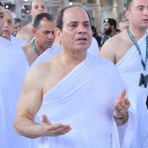 وظهر الرئيس المصري وهو يدعو الله في المسجد الحرام، وبجانبه معتمرون.