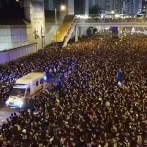 تداول رواد مواقع التواصل الاجتماعي مقطع فيديو يرصد لحظة مرور سيارة إسعاف خلال مظاهرات في مدينة هونغ كونغ بالصين.