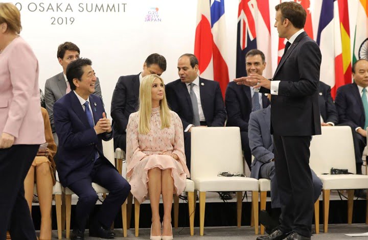 تداول إعلاميون وصحفيون أمريكيون على مواقع التواصل الاجتماعي تسجيلا مصورا بثته الرئاسة الفرنسية، يظهر إيفانكا ترامب ابنة الرئيس الأمريكي وهي تقف إلى جوار قادة أوروبيين على هامش قمة العشرين التي استضافتها أوساكا اليابانية الجمعة الماضي.