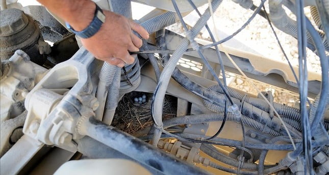أخرجت شركة مقاولات تركية، شاحنة عن الخدمة، بعدما اكتشفت أن زوجاً من الطيور قد بنى عشه في قسم المحرك.