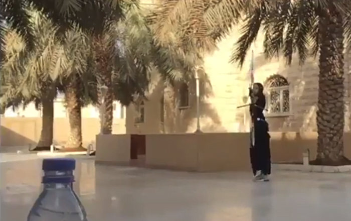 وظهرت العتيبي في الفيديو وهي تقوم بإصابة غطاء القارورة عن طريق الرمي بالسهم لتفوز بتحدي غطاء الزجاجة.