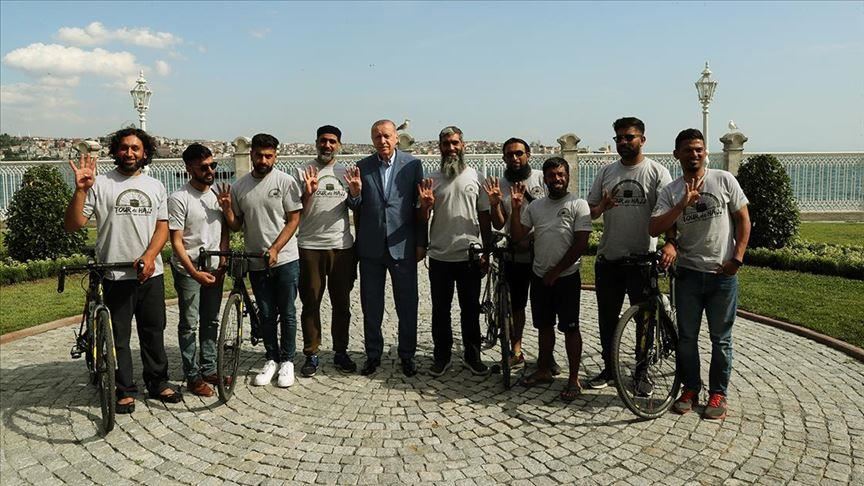 التقى الرئيس التركي رجب طيب أردوغان، السبت، وفدا من الحجاج المسلمين القادمين من بريطانيا على دراجاتهم الهوائية، في مدينة إسطنبول.