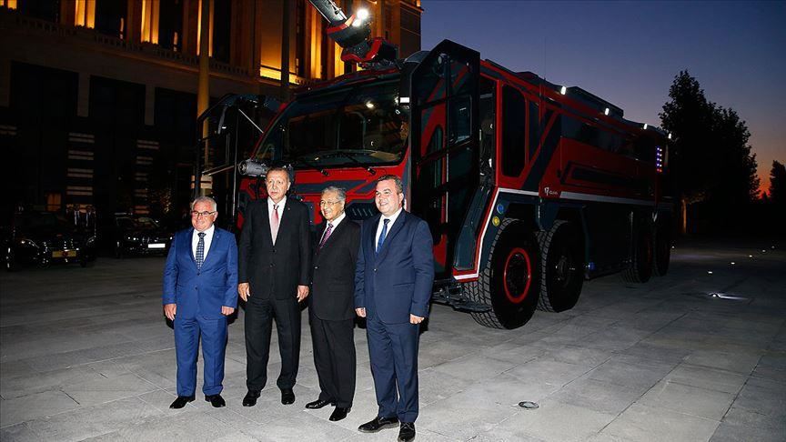 تفقد كل من الرئيس التركي رجب طيب أردوغان، ورئيس الوزراء الماليزي مهاتير محمد، عربة الإطفاء التركية “فولكان” محلية الصنع، التي اشترت ماليزيا 17 منها.