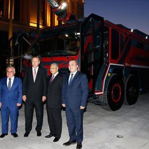 تفقد كل من الرئيس التركي رجب طيب أردوغان، ورئيس الوزراء الماليزي مهاتير محمد، عربة الإطفاء التركية “فولكان” محلية الصنع، التي اشترت ماليزيا 17 منها.