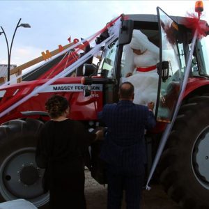 استخدم عريس تركي، في ولاية سيواس وسط البلاد، جرارًا لنقل زوجته من بيت اهلها، بدل سيارة ليموزين، كما جرت العادة في حفلات الزفاف.