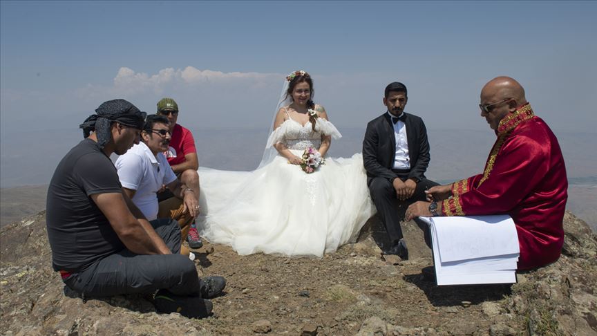 عقد شاب وفتاة قرانهما، على قمة جبل “تيكيلتي” بولاية أغدير شرقي تركيا، بارتفاع 2550 مترا عن سطح البحر.