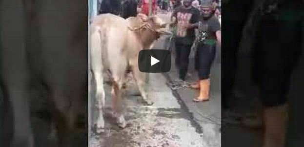ويظهر مقطع الفيديو الجزار وهو يحاول انتهاز الفرصة للإمساك بالبقرة، إلا أن البقرة لم تستسلم وقامت بركل الجزار، ما أدى لسقوطه على الأرض مغما عليه.