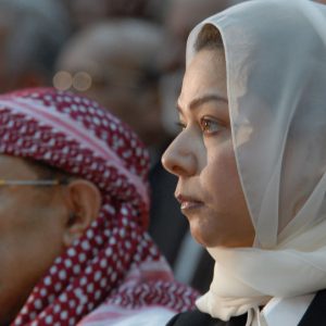 وتظهر رغد صدام حسين خلال استقبال والدتها لسوزان مبارك، إلى جانب شقيقتها رنا صدام حسين وزوجة ابنه لمى ماهر عبد الرشيد.