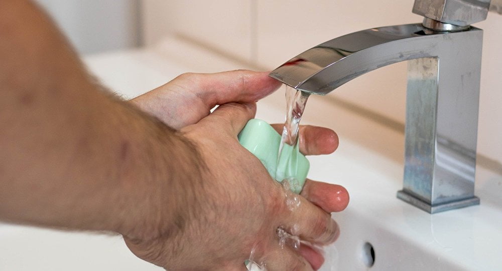 1- بلل يديك بالماء الجاري النظيف وضع الصابون تحت الماء للحصول على الرغوة.