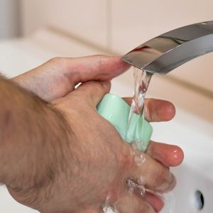 1- بلل يديك بالماء الجاري النظيف وضع الصابون تحت الماء للحصول على الرغوة.