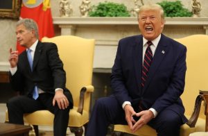 امتعض الرئيس الفنلندي، سولي نينيستو، عندما وضع نظيره الأمريكي، دونالد ترامب، يده على رجله أثناء مؤتمر صحفي، في البيت الأبيض، الأربعاء.