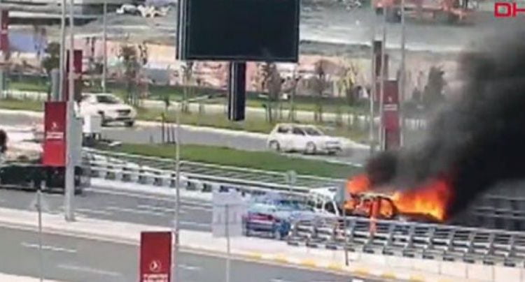 اندلع حريق في حافلة صغيرة عند مدخل مطار إسطنبول الجديد.