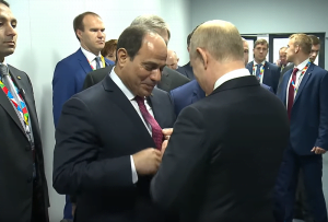 تظهر اللقطات أن بوتين والسيسي يرتديان نفس القمصان البيضاء، وربطات العنق الحمراء والسترات السوداء، ولاحظ بوتين نفسه تطابق الألوان، وضحك كلاهما للصدفة.