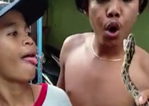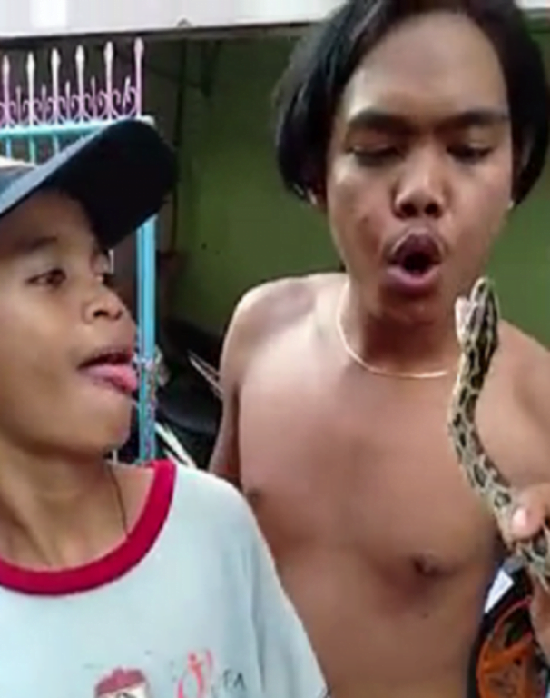 وقف صبي إندونيسي فاتحاً فمه وقد أخرج لسانه، بجواره وقف شاب وبيده حية صغيرة من نوع الأصلة، حاول الصبي مضايقة الحية بلسانه، بينما كان الشاب ينفخ في وجه الحية ثم يقربها من فم الصبي، حتى وقعت المفاجأة المروعة.