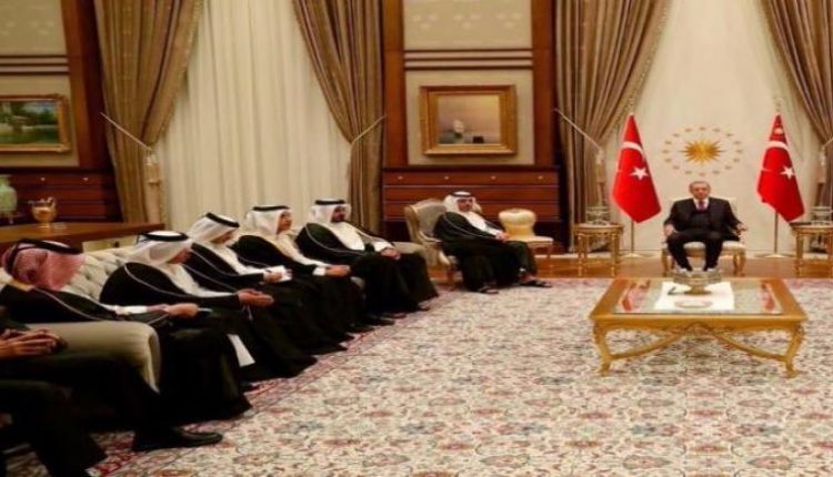 وكانت صورة لهذا الاجتماع أظهرت الرئيس التركي “أردوغان” وهو يجلس بين علمين لتركيا، بينما خلت القاعة من أي علم لقطر، أثارت جدلًا واسعًا عبر مواقع التواصل بالخليج، وعبر المغردون عن سخطهم وسخريتهم من النظام القطري الذي تسبب في استهزاء تركيا وعدم اعتبارها للقيمة القطرية، بحسب وصفهم.