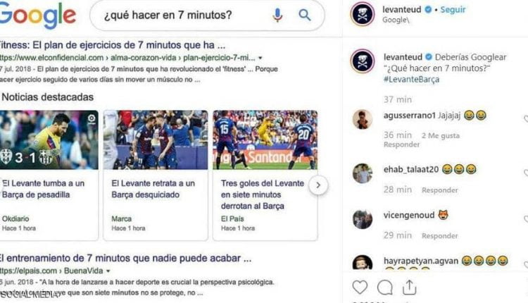 واستغل “ليفانتي” هذه الإجابات ليسخر من برشلونة، حيث نشرت صفحتا الفريق الرسميتان على “تويتر” و”إنستغرام” صورة تظهر نتائج “غوغل”، وعلقت عليها بالقول “غوغل يجيب على سؤال: ما الذي يمكنك إنجازه في 7 دقائق؟”.