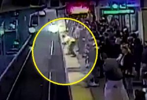 ويظهر الفيديو شخصٌ يسقط على قضبان السكك الحديدية لحظة دخول القطار، ويقف الشخص محاولاً القفز على الرصيف، لكن ربما لم يكن الوقت ليسعفه لعمل ذلك، وهنا تمتد يدٌ بسرعة وترفعه لحظة مرور القطار خلف ظهره.