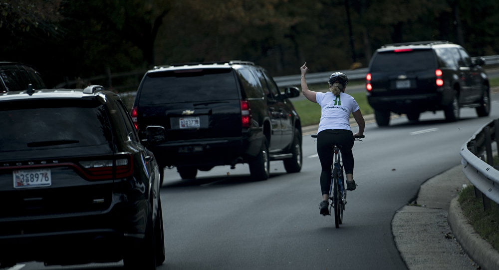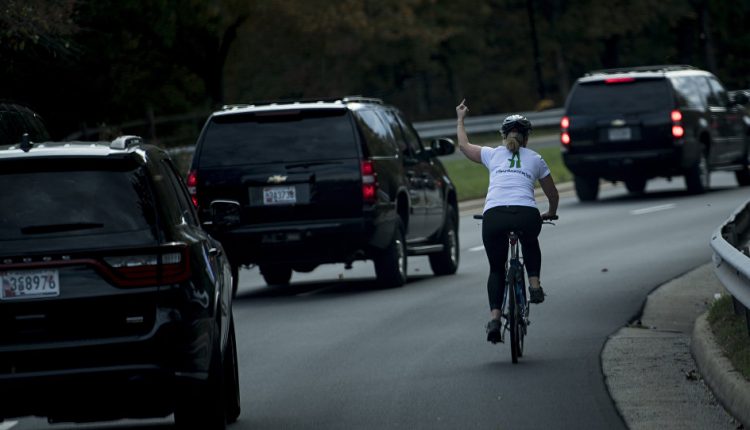 جولي بريسكمان – 52 عاما – طردت من عملها بعد الصورة التي انتشرت لها وهي تركب دراجة وتشير بإصبعها الأوسط لموكب الرئيس الأمريكي في 28 تشرين الأول / أكتوبر من عام 2017، كما تلقت العديد من التهديدات من أنصار ترامب.