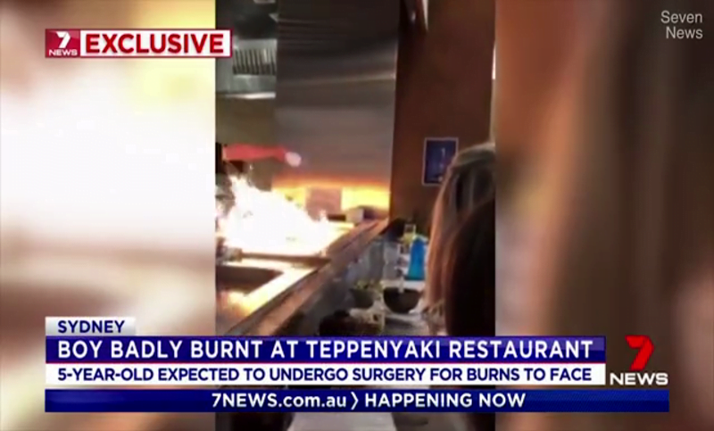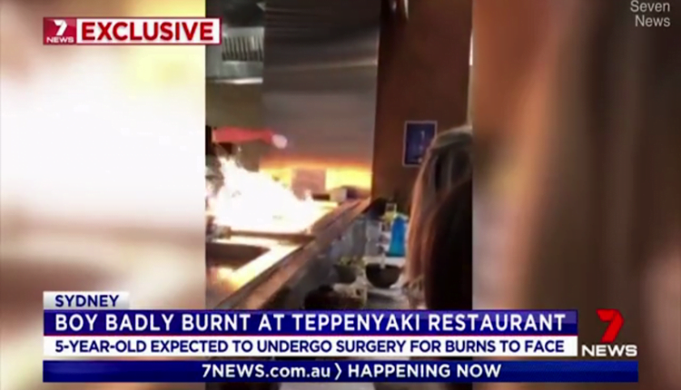 وحسب الفيديو الذي بثه تليفزيون “سفن نيوز” الأسترالي، يظهر الطاهي وهو يضع الطعام على اللوح المعدني الساخن، ويحرك شعلة اللهب بالقرب من الطعام، ثم يضيف الزيت ليزداد اللهب ويشوي الطعام، لكن في لحظة خاطفة رش الطاهي كمية كبيرة من الزيت، توجهت مباشرة وهي مشتعلة نحو الأسرة، ما تسبب باحتراق الطفل ووالده.