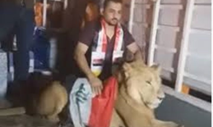 انتشرت مقاطع مصورة، وصور، على مواقع التواصل الاجتماعي في العراق، لشاب يجلب معه “أسدا” إلى أحد التظاهرات في محافظة بابل.