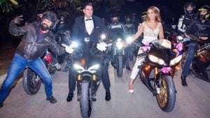 قررت العروس أن تفاجئ الجميع يوم الزفاف بلوك شبه رياضي ليتسنى لها ركوب دراجتها النارية رفقة زوجها وباقي “الشلة”، ويجوبوا بعدها شوارع المدينة في زفة أشبه بسباق رياضي.