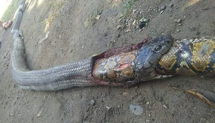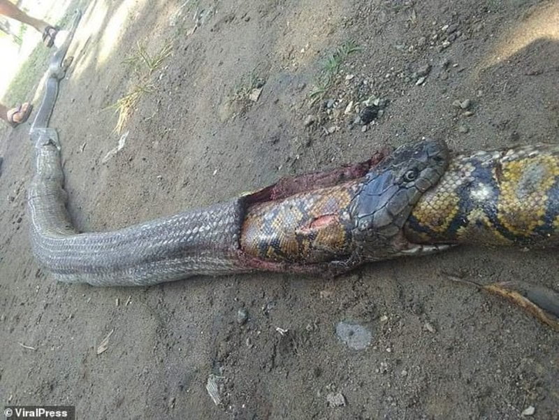 وحسب الصحيفة، كانت أنياب الكوبرا مغروسة في جسد الحية الأخرى؛ فقام السكان المرعوبون بمهاجمة الكوبرا بالعصي حتى تمكنوا من قتلها وتمزيق جسدها.