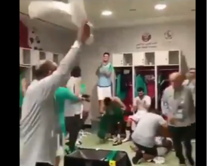 تداول ناشطون بموقع التواصل تويتر مقطعا مصورا أظهر لحظة احتفال لاعبي المنتخب السعودي داخل غرفة تبديل الملابس، بالفوز على منتخب قطر والصعود لنهائي كأس الخليج.