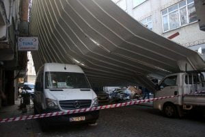 نجا مواطن تركي من موت محقق بعد تطاير سقف مبنى مكون من أربع طوابق في حي بيوغلو باسطنبول نتيجة رياح شديدة ضربت المدينة صباح اليوم.