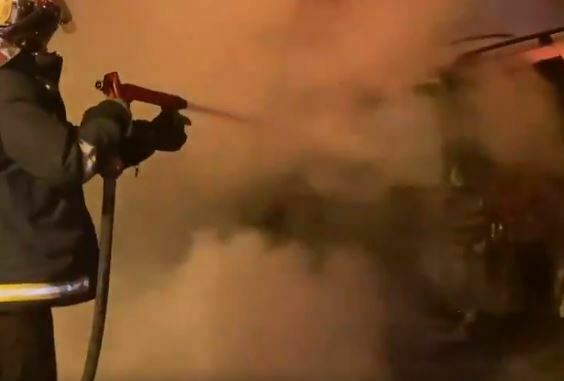 ويظهر الفيديو المنشور احتراق سيارة متوقفة ويحاول قسم الإطفاء إطفاء الحريق.