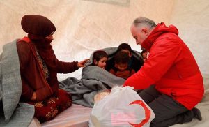 وزار كينك اللاجئين السوريين في المنطقة الآمنة على الحدود التركية بعد فرارهم من الهجوم الجوي الذي نفذته القوات الجوية الروسية في سوريا.