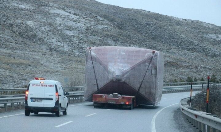 أثار مرور شاحنة تحمل هيكلا ضخما بوزن 30 طن، دهشة المارين على الطريق من ملاطيا إلى طرابزون في تركيا.