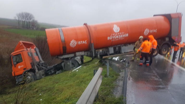 انحرفت مركبة النفايات الصلبة في بلدية إسطنبول مساء الاثنين، بعد محاولتها لتفادي التصادم مع مركبة أخرى في الطريق العام السريع بمنطقة “بيوك شكمجيه” في إسطنبول.