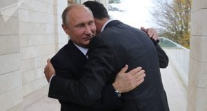 الرئيس السوري بشار الأسد يحتضن الرئيس الروسي فلاديمير بوتين