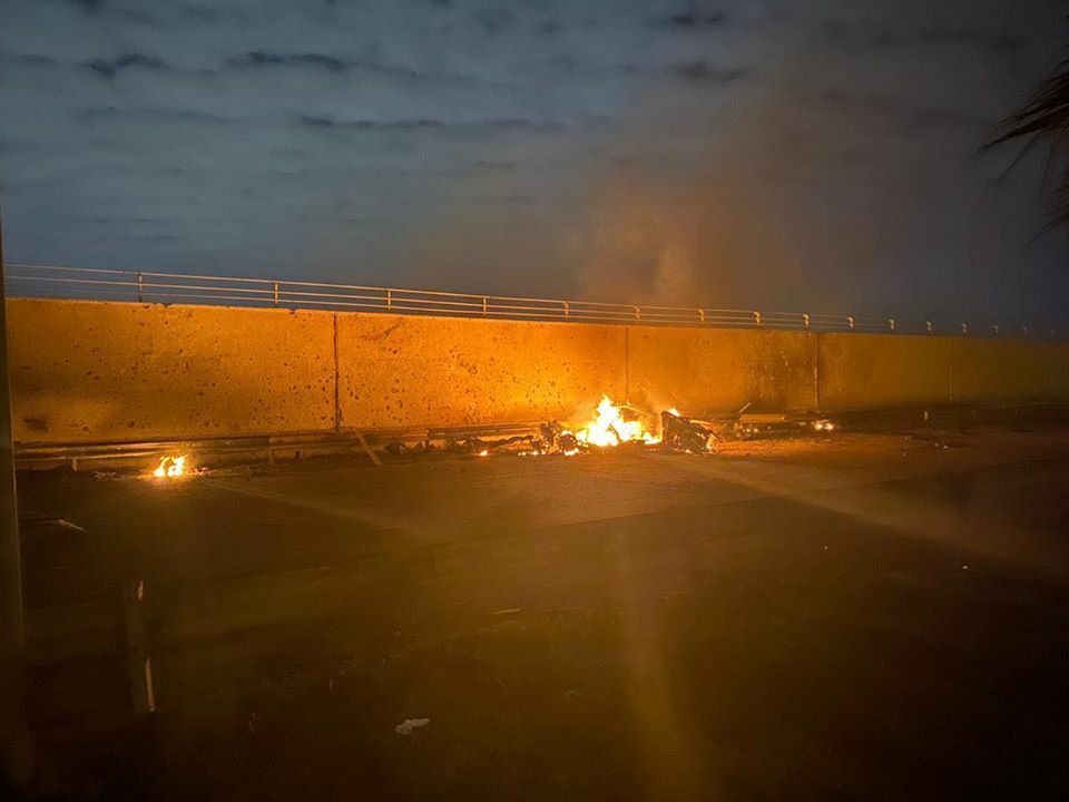 وقال المسؤولون إنه بينما كان ضباط أمن المطار ينظرون، توجهت السيارتان على الطريق الرئيسي المؤدي من المطار. أصاب أول صاروخين أمريكيين المركبة التي كانت تقل سليماني ومهندس في الساعة 12:55 صباحًا.