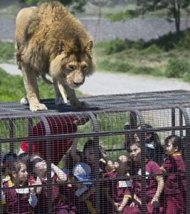 وبمجرد رؤية الأسد السيارة يقفز فوق سقفها، ليبدأ الأطفال بتصويرهم عن قرب وإطعامهم باللحوم النيئة من بين الشباك ودغدغة بطونهم وملامسة مخالبهم الضخمة في مغامرة ممتعة، بل كانت بعض الأسود ترقد فوق السيارة فقط للاستراحة.