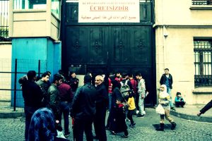 سوريون أمام بوابة لدائرة الهجرة في إسطنبول