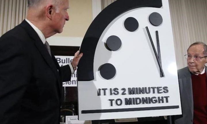 ويُشير عدد الدقائق التي قبل منتصف الليل إلى احتمال نشوب حرب نووية، أما توقيتها الآن فهو دقيقتان قبل منتصف الليل، بحسب ويكيبيديا.