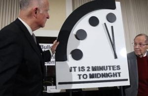 ويُشير عدد الدقائق التي قبل منتصف الليل إلى احتمال نشوب حرب نووية، أما توقيتها الآن فهو دقيقتان قبل منتصف الليل، بحسب ويكيبيديا.