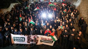 وحرص المحتجون على رفع لافتات عليها عبارات مناصرة للقدس من قبيل “القدس إسلامية”، و”سلام على القدس”، و”نحن يقظون من أجل فلسطين”، ورددوا هتافات مناهضة للولايات المتحدة وإسرائيل.
