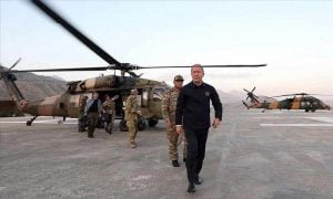 توجه وزير الدفاع المدني خلوصي أكار إلى الحدود السورية برفقة رئيس الأركان العامة الجنرال يشار جولار بقيادة القوات المسلحة التركية بعد إجراء تقييم موجز للوضع الراهن في مقر القيادة بانقرة.