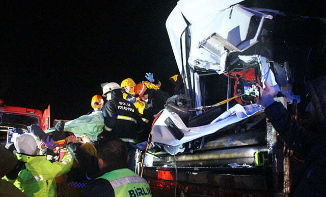 تمكنت فرق الإنقاذ التركية أخيرا من تحرير سائق شاحنة يدعى سادات أرش٬ بعد ساعتين متواصلتين من العمل ، كان قد علق في مركبته بعد اصطدامه بشاحنة أمامه على خط التم٬ السريع بمدينة بولو ا شمال تركيا حوالي الساعة الواحدة بعد منتصف الليل.