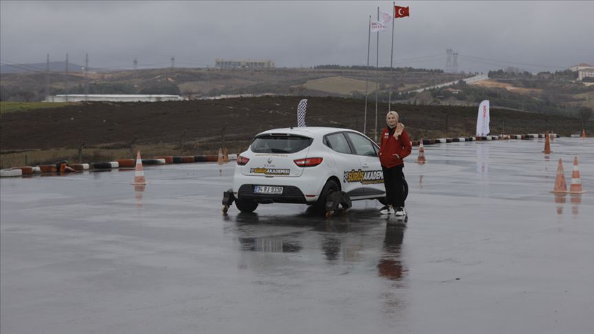 ورصدت عدسة الأناضول من خلال كاميرا جوية وبرغم انخفاض درجات الحرارة والأمطار، مواصلة شيمشك استعدادها في مضمار للتدريب على تخطي العوائق مستخدمة سيارة عادية غير مخصصة للسباق.
