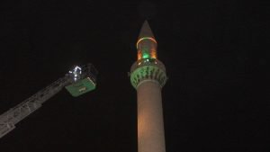 وفتحن الكوادر الإطفائية أسفل المئذنة قطعة كبيرة من “النايلون المطاطي”، وذلك اتباعًا لإجراءات سلامة المواطن في حال ألقى بنفسه.