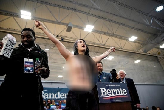 فاجأت فتيات عاريات الصدر السيناتور الديمقراطي بيرني ساندرز منافس الرئيس الأمريكي دونالد ترمب خلال حملته الانتخابية للرئاسية الأمريكية 2020.